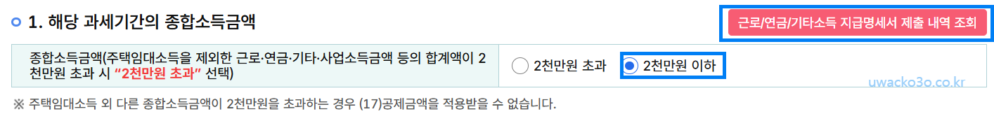 3. 근로/연금/기타 소득 지급명세서 제출내역을 조회하시고 소득금액 요건을 확인합니다.