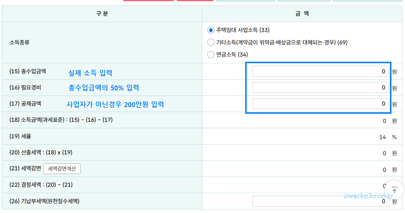 - 연간 임대수입금액: 2,000만 원 이하