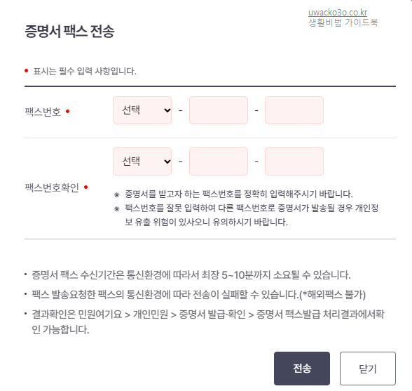 집에 프린터기가 없다면 회사의 팩스번호를 입력하시면 건강보험 자격득실확인서를 회사로 바로 받으실 수 있습니다.