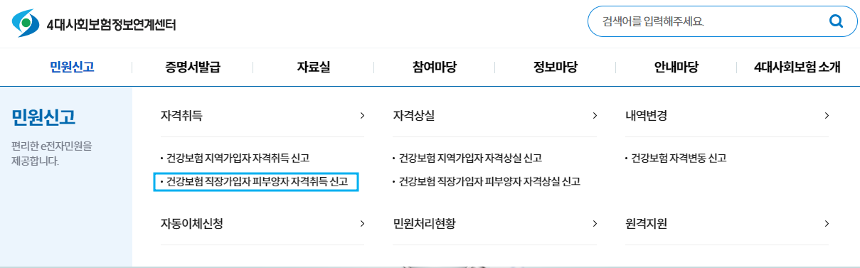 4대사회보험정보연계센터에 접속해 [건강보험 직장가입자 피부양자 자격취득 신고]를 클릭합니다.