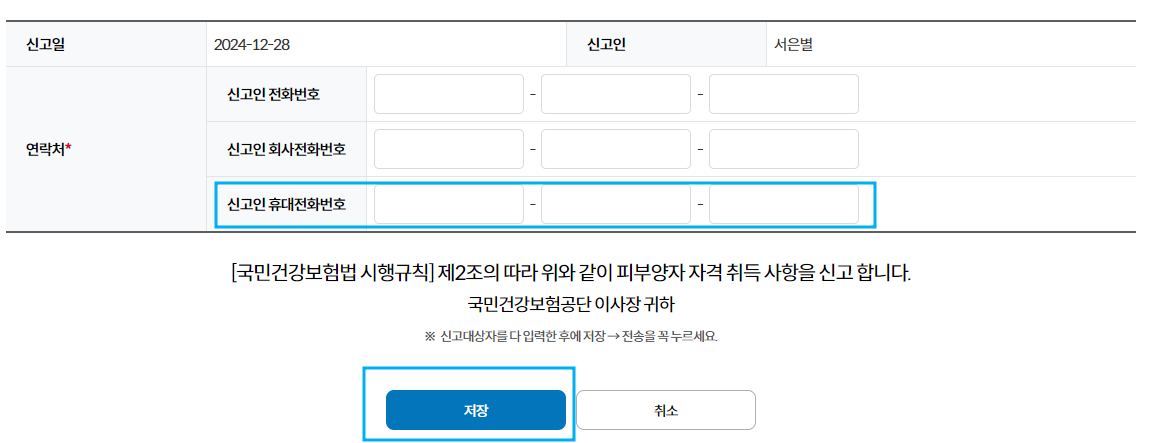 부모님 건강보험 피부양자 등록을 위해 주민등록번호, 성명, 가족관계, 취득연월일, 취득부호를 입력해줍니다.