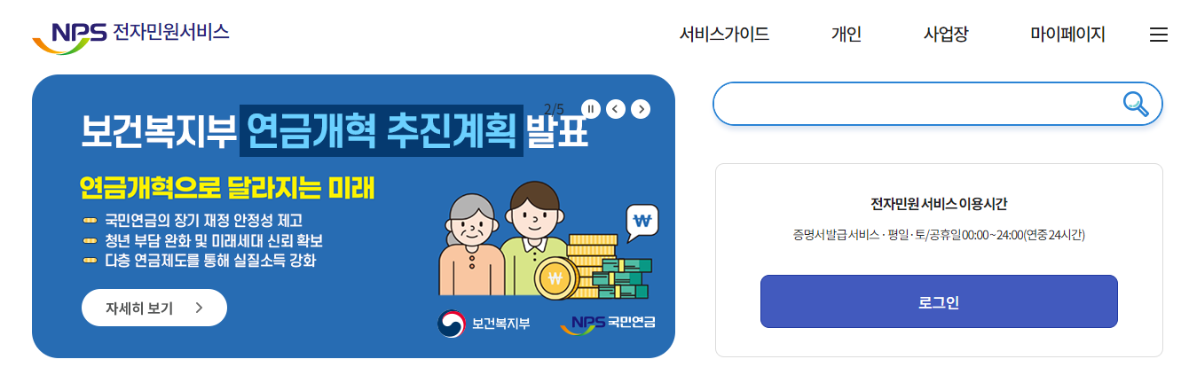 1. 국민연금공단 전자민원서비스로 접속합니다.