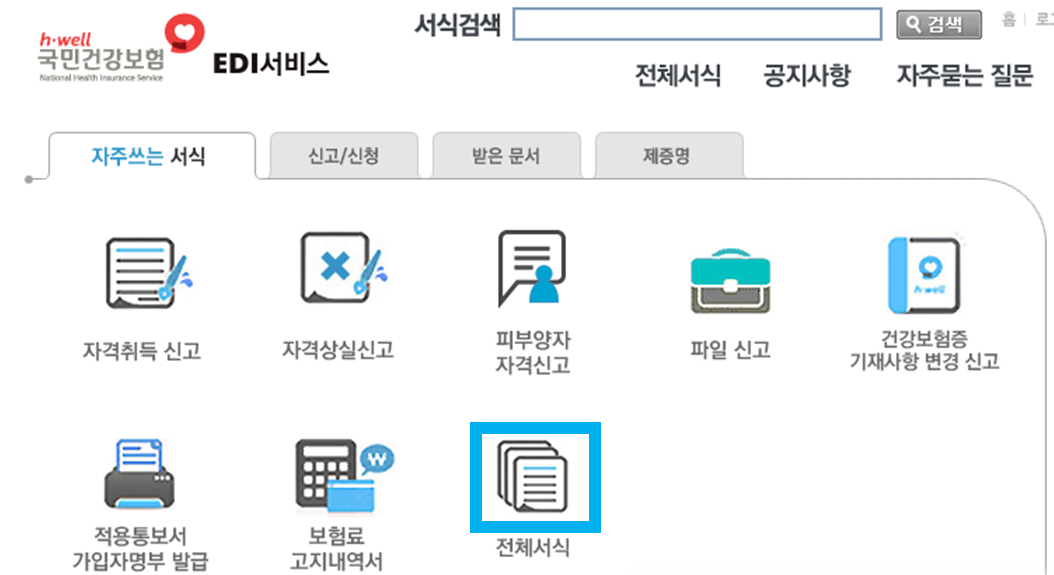1. 건강보험 EDI 접속하고 전체서식을 눌러줍니다.