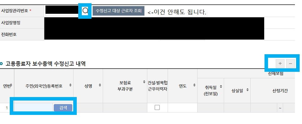 사업장관리번호 조회➡️+눌러서 직원 추가 ➡️ 고용산재 보수총액 수정신고 직원 입력